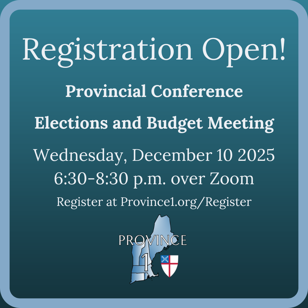 Please register for the conference at province1.org/register. All voting will be conducted by the delegates (elected by diocesan convention) and bishops of Province 1. Provincial ministry leaders and guests are welcome to attend the conference to learn more about regional ministry in the Episcopal Church in New England.
